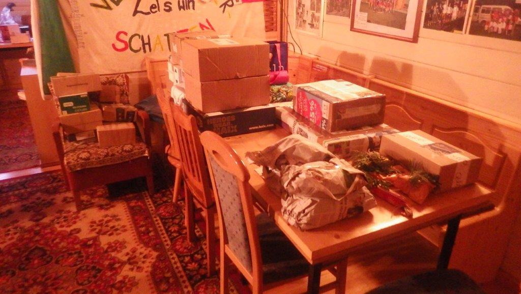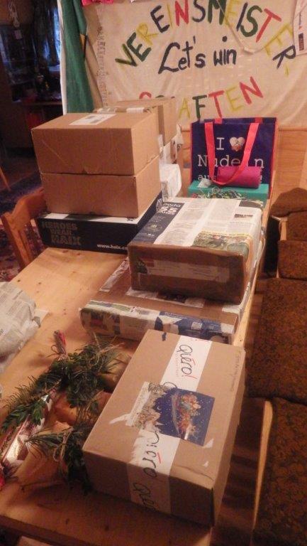 Das hatte natürlich auch etwas Gutes. Wir mussten nicht, wie in den letzten Jahren, sechzig bis siebzig Päckchen packen. Charlotte und Chiara stellten nun die dementsprechenden Pakete für die Bestellungen zusammen. Da sie nicht wussten, wer alles Pakete abgegeben hatte, musste ich ein wenig aufpassen, dass nicht Jemand sein eigenes Paket wiederbekommt. |